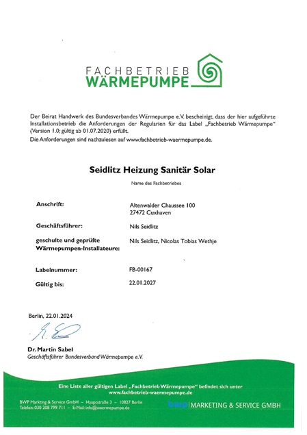 Das Gütesiegel „Fachbetrieb Wärmepumpe“ steht für die damit verbundene Qualität, Kompetenz und den Service im Wärmepumpenhandwerk. Die Firma Seidlitz, als zertifizierter Fachbetrieb für Wärmepumpen, liefert Ihnen höchste Qualität, umfassenden Service und erstklassige Beratung rund um moderne, effiziente Wärmepumpentechnik. Wir unterscheiden uns zu anderen Handwerksunternehmen durch eine hohe Qualifikation unserer Mitarbeiter, Schulungen und Prüfungen sowie einen hohen Qualitätsanspruch bei der Installation und Betreuung von Wärmepumpenanlagen.